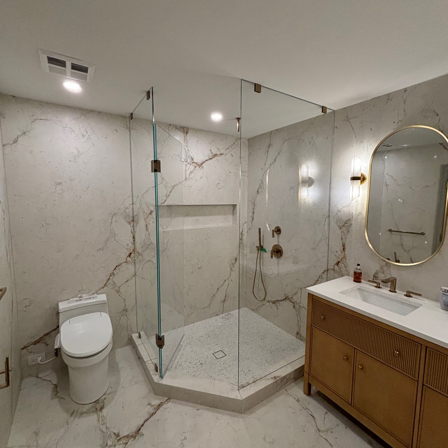 We transformed this bathroom into a sleek, modern retreat by installing stunning 4×8 large-format tiles from floor to ceiling. The seamless tile design enhances the sense of space while ensuring easy maintenance and durability. This renovation included meticulous waterproofing and precision tile alignment for a flawless finish.